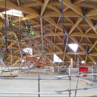 Das Klebeverfahren wurde erstmals bereits 2016 im Rahmen einer Zulassung im Einzelfall bei der Sanierung einer doppelstöckigen Sporthalle in Berlin erfolgreich angewendet (s.a. BAUEN MIT HOLZ 3.2017, S. 22 ff). Der hölzerne Trägerrost des Dachs hatte sich stark verformt. Im Rahmen der Sanierung wurde das gesamte Dachtragwerk angehoben und die bis dahin offenen Zwischenräume der gekreuzten Brettschichtholzbalken mit Füllhölzern geschlossen, die mit dem WEVO-Spezialharz (in dem Fall noch das Sanierungsharz EP 20 VP 1) in das Tragwerk eingeklebt und ohne den Einsatz von Pressdruck kraftschlüssig angeschlossen wurden. Auf diese Weise konnte die Gesamtsteifigkeit des Trägerrosts signifikant erhöht werden.